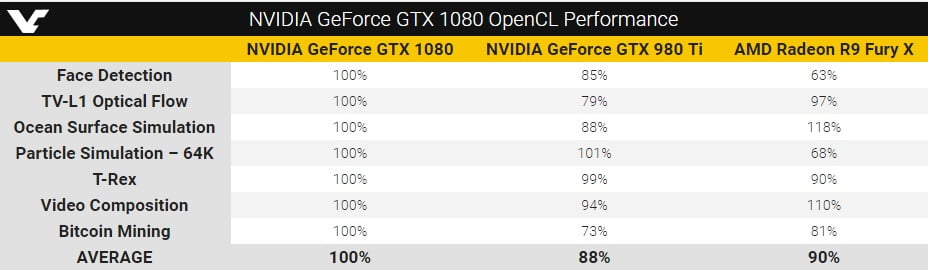 با این حال،کارت گرافیک GTX1080 در حال حاضر در صدر جدول دو آزمون Bitcoin Miningو Face Detection قرار دارد.هر دو آزمون مربوط به پایگاه داده CB است.عملکر در OpenCL تا حدودی به درایور کارت گرافیک نیز وابسته است.در نتیجه امید آن می رود که در آینده و با بروزرسانی های درایورها،توان GTX1080 در این آزمون بهبود یابد.یادتان باشد که آزمون OpenCL در 9 مرحله متفاوت انجام پذیرفته و کارت گرافیک ها در این آزمون ها رفتارهایی متفاوت را به نمایش گذاشته اند.