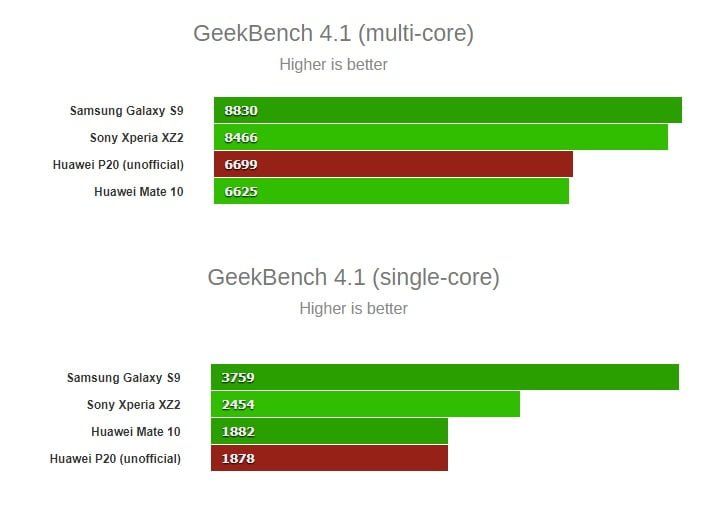 گوشی پی20 هواوی در بنچمارک گیک بنچ در بخش تک هسته ای امتیاز 6699 را کسب کرده است که این، در مقایسه با امتیاز میت 10 هواوی کمی بهتر است. اما از پرچمدار جدید سامسونگ پایین تر می باشد. در بخش تک هسته ای پی 20 از هر دو گوشی امتیاز کمتری کسب کرده است. البته بدلیل آنکه این گوشی هنوز به صورت رسمی معرفی نشده است، هنوز نمی توان با قطعیت این امتیازات را تأیید یا تکذیب کرد.