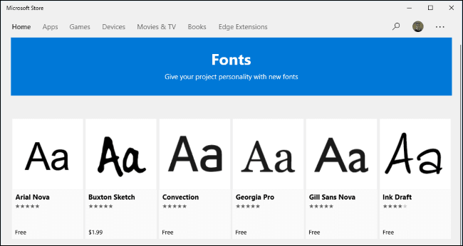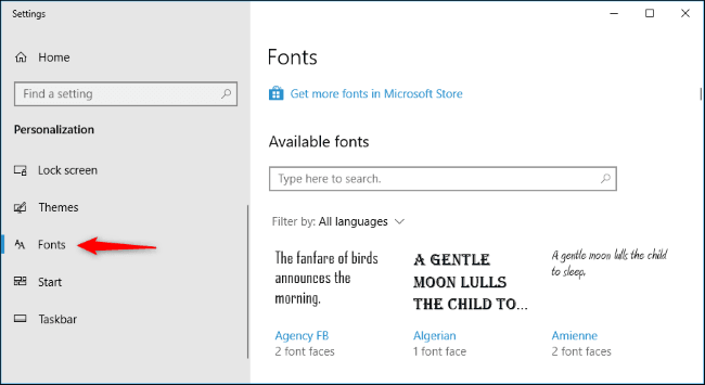 این ویژگی در بروزرسانی آوریل 2018 به ویندوز 10 اضافه شد و از این پس شاهد گزینه ی Fonts در بخش تنظیمات خواهیم بود. همچنین از این پس می توانید با کلیک بر روی Get more fonts in Microsoft Store وارد فروشگاه مایکروسافت شوید و فونت های بیشتری را دانلود و نصب نمایید. در فروشگاه فونت های رایگان دسته بندی شده است و به راحتی می توانید این فونت ها انتخاب کنید.
