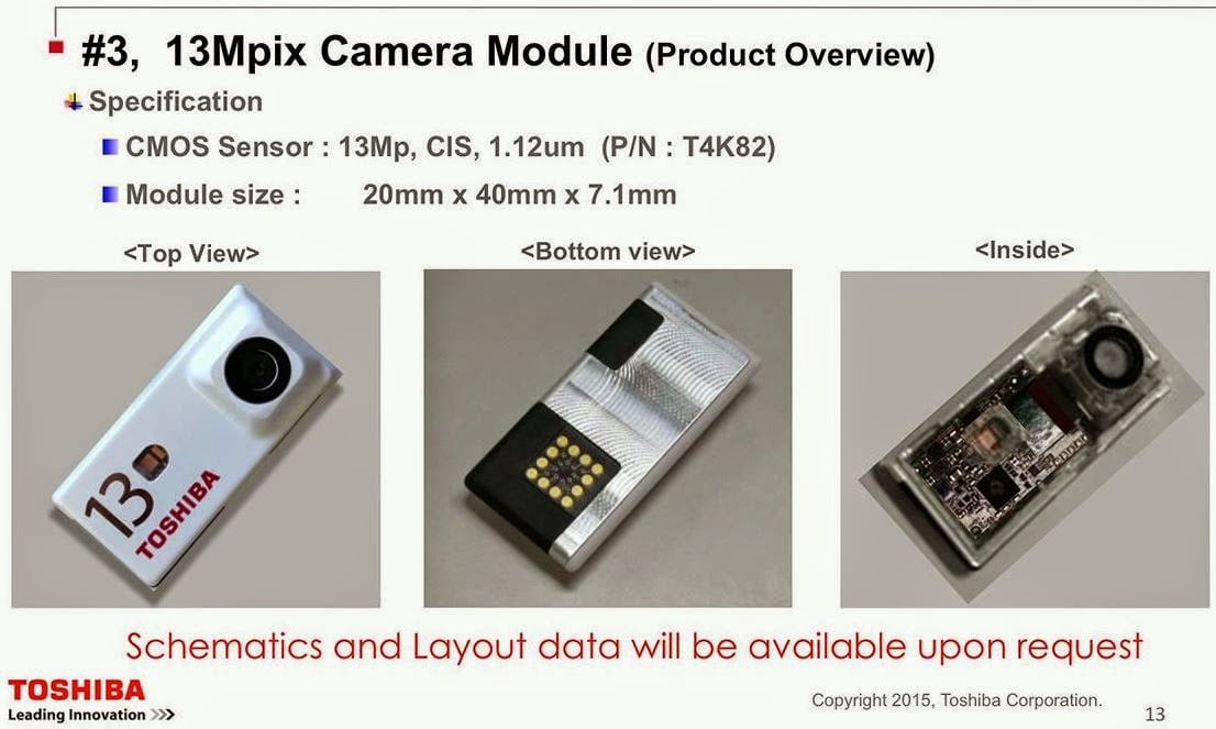 این نمایشگاه فرصت مناسبی برای شرکت هاست تا توانایی خود را با ساخت ماژول های اختصاصی به نمایش بگذارند. شرکت ژاپنی توشیبا نیز که به روال معمول ژاپنی ها همیشه برای پروژه های بلندپروازانه پیشگام است، یک پکیج سه عددی از دوربین های ماژولار را تولید نموده و بر اساس نقشه راه سه ساله خود می خواهد آنها را سال میلادی آینده به تولید انبوه برساند. این ماژول ها شامل یک دوربین جلو 2 مگاپیکسلی و دو دوربین پشت، یکی 5 و دیگری 13 مگاپیکسلی می باشد. دوربین کوچکتر به ترانزیستورهای 1.4 میکرونی تجهیز شده، در حالی که سنسور دوربین 13 مگاپیکسلی از ترانزیستورهای 1.12 میکرونی بهره می برد.