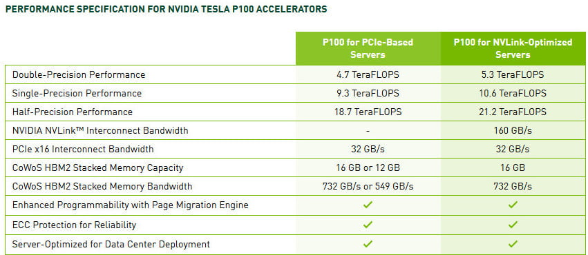 انویدیا مدعی آن شده است که استفاده از یک شتاب دهنده ی P100 سرعتی بیش از یک سرور با دو پردازنده Intel Xeon E5-2698 V3 را در اختیار سامانه قرار می دهد. همچنین انویدیا در ادامه اضافه کرده است که 4 کارت گرافیک Tesla P100 در مسیر PCIe 3.0 می تواند جایگزین 32 گره CPU شده و تا 70% باعث صرفه جویی اقتصادی می گردد. کارت گرافیک Tesla P100 در دو نمونه مبتنی بر PCIe و NVLink راهی بازار می شود.