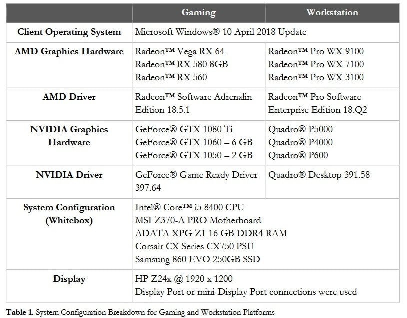 در آزمون مختص کارت گرافیک های AMD، در بخش گیمینگ، کارت گرافیک های Radeon RX Vega 64, RX 580 و RX 560 در این آزمون شرکت کرده و در بخش سیستم های ایستگاه کاری نیز شاهد استفاده از کارت گرافیک های Radeon Pro WX 9100, WX 7100 و WX 3100 هستیم. همچنین درایورهای Radeon Adrenalin 18.5.1 و Radeon Pro Enterprise 18.Q2 برای این منظور مورد استفاده قرار گرفته اند.