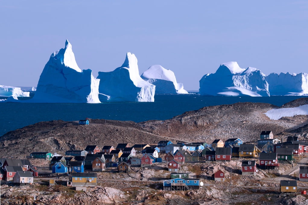خانه های رنگارنگ در کنار خط ساحلی ناحیه خودگردان گرینلند (بخشی از دانمارک) که به زیبایی با یخچال های طبیعی در فلات اسکورسبای سوند ترکیب شده اند.