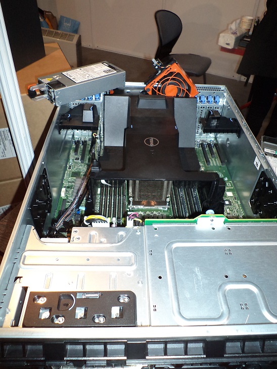 علاوه بر آن کامپیوترهای سرور این کمپانی نیز قابل مشاهده بودند.در آنجا سیستم های T430 و R730 به صورت باز در اختیار ما قرار داده شد.مادربردهایی مزین با نام دل و دو پردازنده به صورت همزمان (Zeon E5-2600V3) و 24 اسلات حاظفه رم از نوع ECC نیز به خوبی خود نمایی می کنند.از سوی دیگر کامپیوترهای دسکتاپ کمپانی لنوو (E73) نیز برای نمایش در نظر گرفته شده بود.بدنه و قالب نهایی کیس،اسمبل و انتخاب قطعات نیز بسیاری رضایت بخش بود اما متاسفانه کانفیگ های موجود از برند لنوو چندان قدرتمند نبوده و دارای سخت افزاری حداقلی بودند.قیمت کامپیوترهای دسکتاپ خانگی این برند از 11 میلیون و 700 هزار تومان آغاز می گردد که برای خرید اینچنین سخت افزاری بسیار بالا است.سیستم های خنک کننده در کامپیوتر سرور دل در تکاملی جدید از سوی این کمپانی دستخوش تغییرات برجسته ایی شده است.دراین طراحی دل فن های کولر پردازنده را از آن جدا کرده و تمامی قسمت های پردازنده و حافظه های رم را در زیر یک پوشش خنک کننده انحصاری قرار داده است که فن های 12 سانتی متری و چند لایه حمایت می گردد.