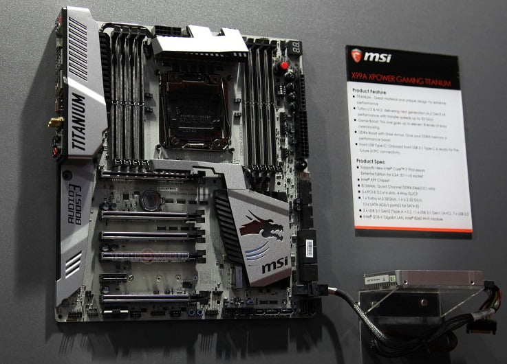 در روزهای پیشین،MSI دو مادربرد مبتنی بر Z170 و X99 را نمایش داده بود.اما به عنوان اولین مادربرد به یک شاهکار X99 می رسیم. X99A XPower Gaming Titaniumبه سوکت پردازنده LGA 2011-v3 مجهز بوده و برای پذیرایی از پردازنده های Broadwell-E بهینه شده است.سری جدید مادربردهای تیتانیوم از امکانات متعدد به منظور اورکلاک برخوردار هستند.PCB با رنگ نقره ای روشن،اولین چیزی است که در سری تیتانیوم به چشم می خورد.8 اسلات حافظه رم DDR4،تعداد 5 اسلات PCI-Express 3.0 x16،پشتیبانی از حافظه های U.2 و M.2،پشتیبانی کامل از حافظه های NVME،پورت USB 3.1،شاسی های اختصاصی اورکلاک،نرم افزار 5 الی 8 مرحله ای و بخش کاملا جداگانه برای مدار صوتی،از جمله دیگر امکانات این مادربرد است.