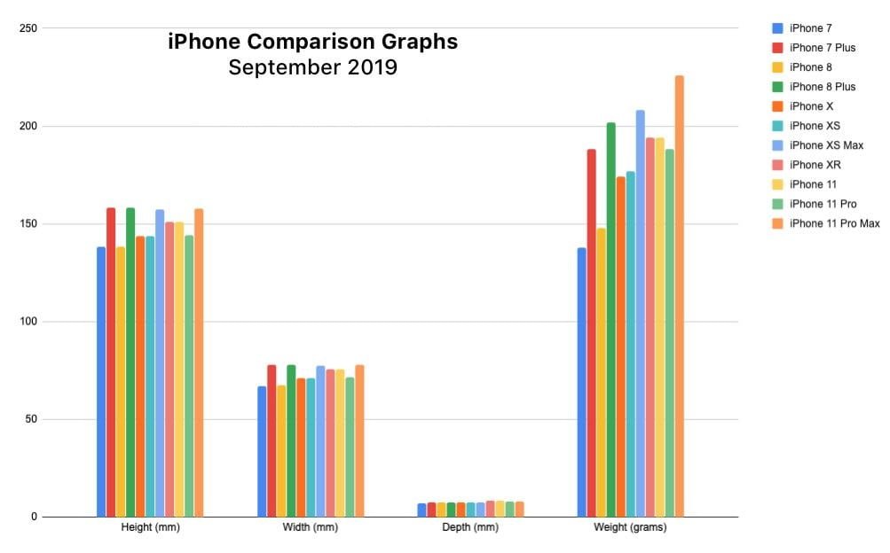 در اوایل این هفته، اپل رسماً گوشی های هوشمند پرچمدار آیفون 11 پرو و آیفون 11 پرو مکس را معرفی کرد. سری جدید iPhone 11 Pro با قیمت 999 دلار عرضه میشود و با پیشرفت های مختلفی نسبت به نسخه قبلی خود همراه است. اما به تازگی یک جدول و نموداری ایجاد شده که اندازه های نسبی، وزن و ویژگی های اصلی آیفون را با گذشت زمان مقایسه میکند. در نمودار و جدول زیر میتوانید این بررسی را مشاهده نمایید. در واقع این نمودارها نشان میدهند که چگونه آیفون ها در طول زمان از لحاظ وزن و قیمت افزایش یافته اند.