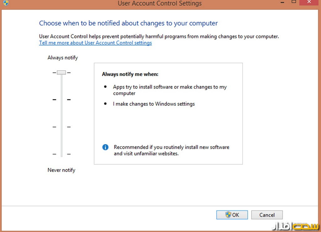 UAC یا همان User Account Controller، یک قابلیت امنیتی در سیستم عامل ویندوز جهت نصب نرمافزار یا اجرای یک نرمافزار است. UAC بهصورت پیشفرض فعال بوده و بهتر است که جهت افزایش امنیت سیستم مورد استفاده خود، این گزینه را فعال نگه دارید. با استفاده از این قابلیت هر نرمافزار پیش از اجرا یا نصب شدن باید اجازه کاربر را دریافت کند. در نتیجه میتوان تا حدودی جلوی ویروسها و برنامههای مخرب را گرفت. جهت فعال کردن این قابلیت باید وارد Control Panel شده و گزینه User Accounts و سپس گزینه Change User Account Controller را انتخاب کنید (تصویر 1).