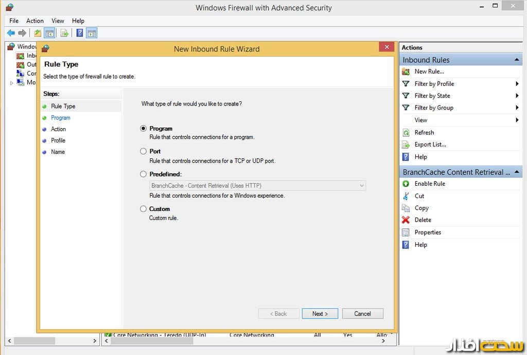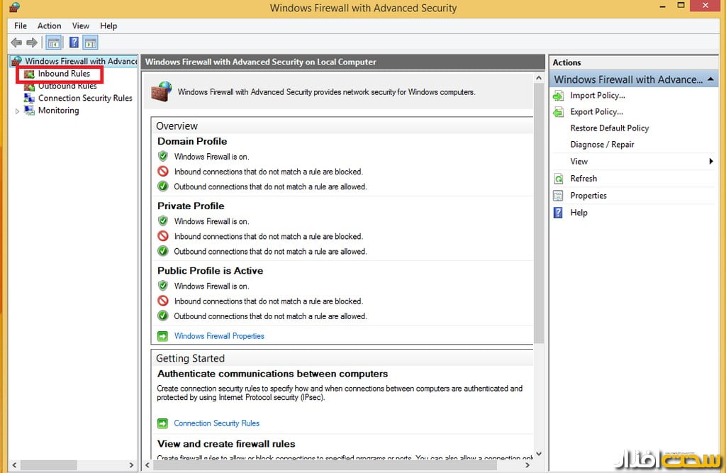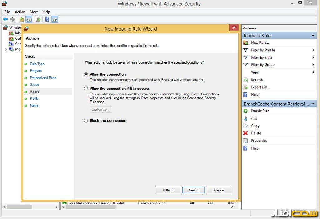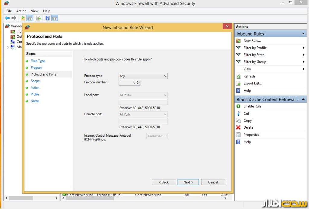 بهاین منظور داخل Control Panel شده و گزینه Firewall را انتخاب کنید. گزینه Change Advance Setting را زده و روی گزینه inbound قرار گرفته و یک rule جدید با زدن گزینه new rule بسازید (تصویر 3).