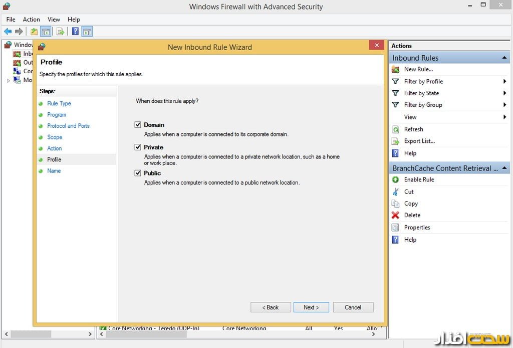 مرحله بعد نوع شبکه را مشخص کرده (تصویر 7) و در مرحله آخر یک نام و توضیح مختصر در مورد قانونی که ایجاد کردهاید تایپ کنید و گزینه Finish را انتخاب کنید.
