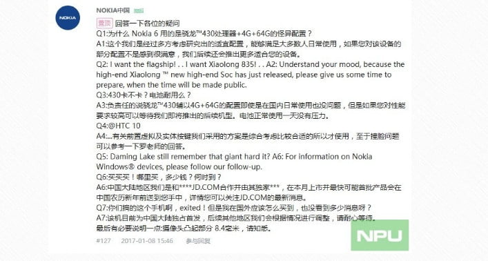 کمپانی از شبکه ی اجتماعی چینی Weibo استفاده کرده است تا پاسخ طرفداران را در مورد پرچمدار نوکیا بدهد و در این پست گفته شده است که پرچمدار نوکیا به چیپست اسنپدراگون 835 کوالکام مجهز خواهد بود و کمپانی اکنون در حال کار بر روی این پردازنده است اما به کمی زمان نیاز دارد تا چیپست برای قرار گرفتن درون پرچمدار نوکیا کاملا آماده شود. زمان معرفی پرچمدار نوکیا هنوز تائید نشده است و ممکن است این گوشی در MWC معرفی نشود و HMD برای معرفی این دستگاه تاریخ دیگری را انتخاب کند و شاهد یک کنفرانس اختصاصی باشیم. این ابهامات تا حدودا یک ماه دیگر مشخص خواهند شد.