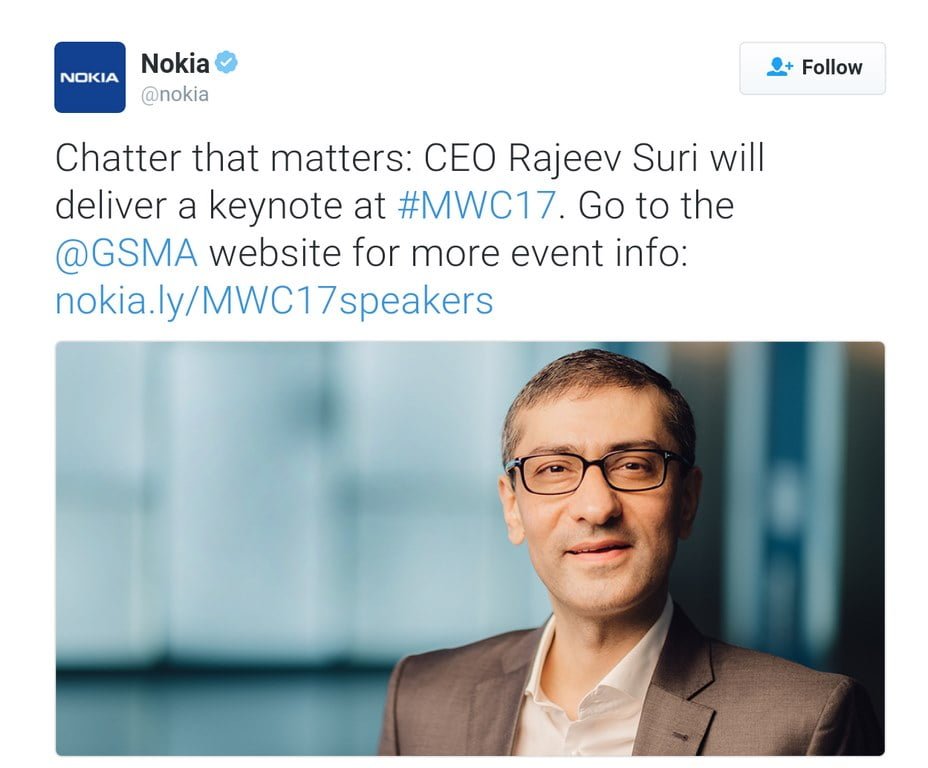 حساب رسمی نوکیا در شبکه ی توئیتر به تازگی توئیتی را به اشتراک گذاشته است که به نوعی خبری را از سوی آقای راحیف سوری، مدیر عامل اجرایی کمپانی نوکیا نقل قول کرده است که حاکی از این دارد که نوکیا در کنگره ی جهانی موبایل سال آینده حضور خواهد داشت و آقای سوری نیز یکی از سخنرانان MWC پیش رو خواهند بود. همان طور که گفته شد از پایان سال جاری نوکیا مجوز استفاده از برند خود را بر روی گوشی های موبایل به دست میآورد، بنابراین میتوان انتظار داشت که این کمپانی فنلاندی در رویداد بزرگ صنعت گوشی های هوشمند که در شهر بارسلونا برگذار خواهد شد، دست کم از یک گوشی هوشمند رونمایی کند. این خبر ممکن است ارتباطی با گزارشات اخیر در مرود گوشی هوشمند نوکیا D1C که اخیرا در بنچمارک های مختلف از جمله AnTuTu و گیک بنچ مشاهده شده، داشته باشد. به هر حال هنوز ماه ها تا زمان نمایشگاه MWC 2017 فرصت باقی است و مطمئنا تا آن زمان شاهد گزارشات بیشتری در این زمینه خواهیم بود. کنگره ی جهانی موبایل 2017 از 27 فوریه تا 2 مارس برگذار خواهد شد.