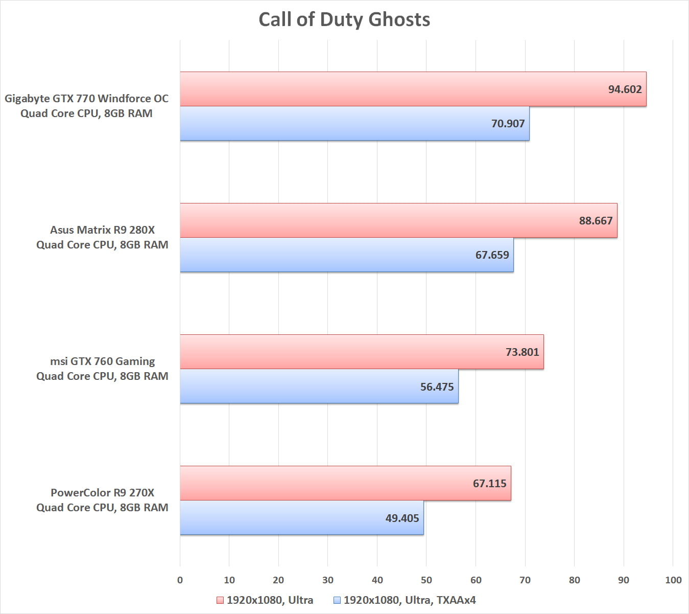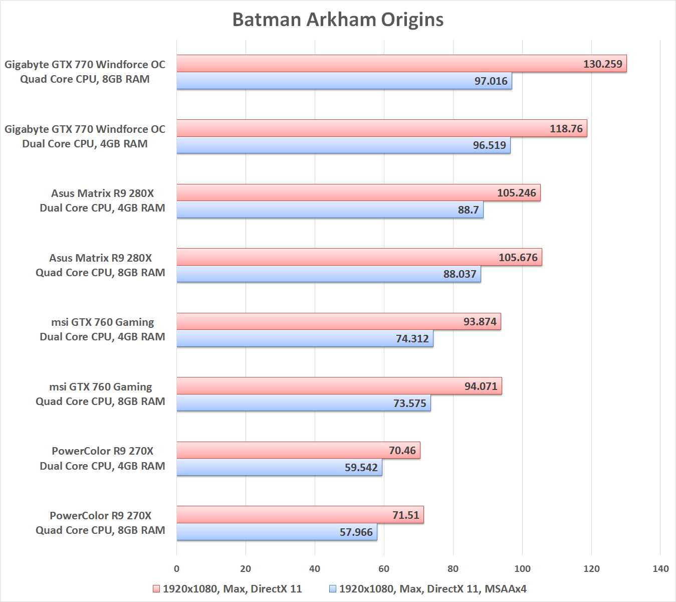 در زمان تست این بازیها، دو کارت گرافیک از سری هفتم محصولات NVIDIA و دو کارت گرافیک از سری R9 تولیدات AMD در اختیار داشتیم. همچنین تصمیم گرفتیم تست کارآیی را در دو حالت دوهستهای و چهارهستهای پردازنده Intel Core i5-4670K بررسی کنیم و در این حالت تنها یک ماژول چهار گیگابایتی از حافظه را به کار بگیریم. بقیه قطعات سیستم تست ما شامل مادربورد Gigabyte Z87X-D3H، هشت گیگابایت حافظه GSkill TridentX DDR3-2400، درایوهای ADATA SX900 128GB و Apacer Turbo II 120GB و منبع تغذیه Green GP1235B میشدند. متاسفانه هیچ یک از بازیها دارای نرم افزار Benchmark داخلی نیستند و به همین خاطر برای تست کارآیی از نرم افزار FRAPS استفاده کردیم. جدول زیر مشخصات فنی کارتهای گرافیک مورد استفاده ما را نشان میدهند: