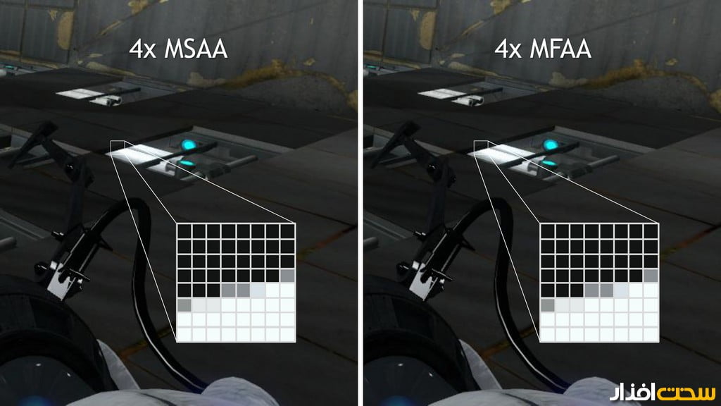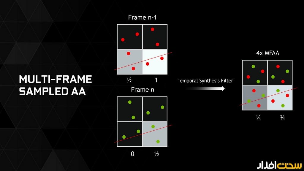 فناوری دیگری که انویدیا معرفی کرده (Multi-Frame sampled Anti-Aliasing (MFAA نام داشته و مانند DSR با anti-aliasing رابطه دارد، منتها در جهتی شاید معکوس با آن! در حالی که تمرکز DSR برافزایش کیفیت تصویر نهایی است، MFAA گونهای بهینه از (Multisample Anti-Aliasing (MSAA بوده و سعی دارد کیفیتی مشابه آن را با نصف همان میزان بار پردازشی ارائه دهد. لازم به ذکر است که DSR پیادهسازی در سطح نرمافزار بوده، اما MFAA به سختافزار مکسول 2 نیازمند است و بر اساس توانایی تازهای که در واحد ROP پردازنده گرافیکی تعریفشده بنانهاده شده است. این توانایی تازه و پیادهسازی سختافزاری به انویدیا امکان میدهد تا به گونهای انعطافپذیر الگوی نمونهبرداری (sampling) درون پیکسلها را بههنگام پردازش MSAA تغییر دهد که همان قابلیت کلیدی است که MFAA را ممکن میسازد. بهعبارتدیگر، MFAA بر مبنای تغییر الگوی نمونهبرداری در هر فریم استوار بوده و در عمل از 2x MSAA (2x به معنای 2 نمونه یا sample است) استفاده کرده و نتایج حاصل از آن را در چند فریم متوالی پیشین به گونهای وارد فریم فعلی کرده و در آن ترکیب میکند که گویا بر آن فریم 4x MSAA اعمالشده باشد. اگر همهچیز بهدرستی پیش رود، ما باید نتیجهای بسیار نزدیک به 4x MSAA را با بار پردازشی 2x MSAA بهدست آوریم (تصویر 6).