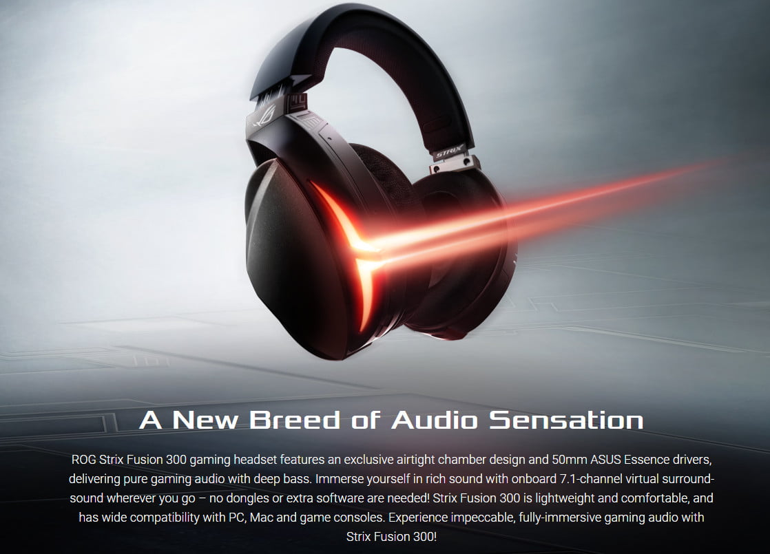 Strix Fusion 300 در زمینه کنترل هوای داخلی کاپ ها نیز بسیار دقیق عمل کرده است تا اطمینان حاصل شود که هوا کاملا در اتاق ها مهر و موم شده و صدای غنی و خالصی را ارائه می دهد. Strix Fusion 300 همچنین دارای باس فوق العاده قوی به همراه اسپیکر های ASUS Essence است که به صورت 50 میلیمتری تنظیم شده است، در آن یک پوشش فلزی، جایگزین یک پوشش پلاستیکی شده است تا که صدای خالص و بدون تحریف ارائه شود.