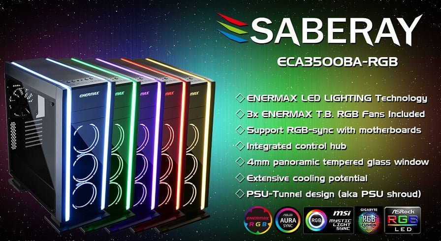 انرمکس (ENERMAX) را می توان تولید کننده ای خلاق، نسبتا کم کار اما کم حاشیه و مطمئن قلمداد کرد که محصولات آن در بازار داخلی ایران نیز یافت می شوند. این شرکت به تازگی کیس پیشرفته و زیبای SABERAY را برای آن دسته از کاربرانی معرفی کرده است که به زیبایی کیس در محیط اطراف خود اهمیت داده و البته از سخت افزارهای روز بهره می برند. SABERAY دارای پنل کناری شفاف بوده و 3 عدد فن نصب شده در جلوی آن نیز دارای دیودهای LED RGB هستند.