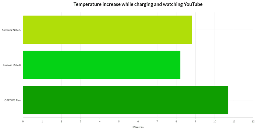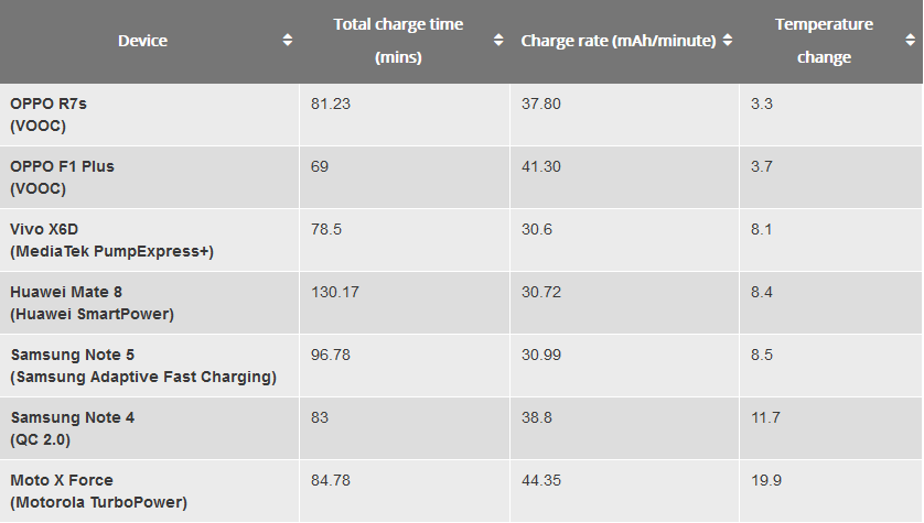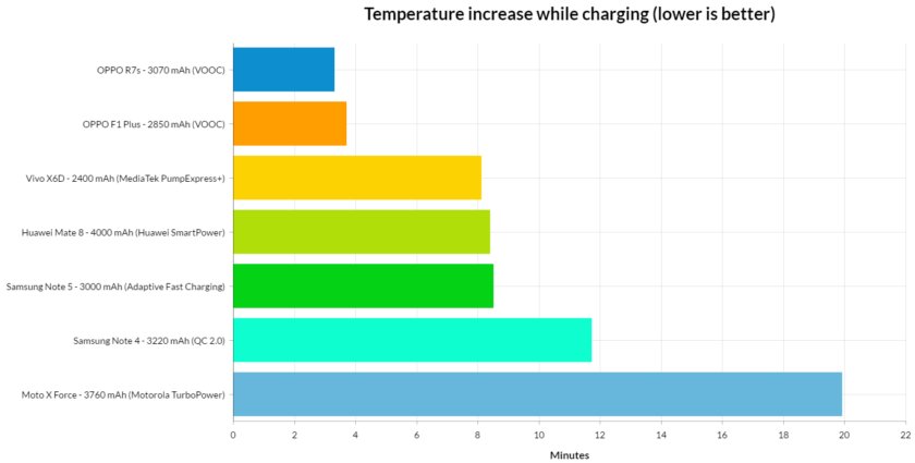 یکی از چیزهایی که در هنگام شارژ کردن باطری ناخواسته تولید میشود، گرما است. این طور به نظر میرسد که زمانی که ما از ولتاژ بالاتری بهره میبریم، گرامی تولید شده نیز بیشتر میشود و شما باید انتظار افزایش دمای 8 درجه سلسیوس یا حتی بیشتر را در زمانی که از شارژ سریع استفاده میکنید که با مقدار 9V کار میکند، داشته باشید. اما یکی از جنبه های شگفت انگیز فناوری VOOC این است که دما را بسیار خوب مدیریت میکند و سرعت سیر صعودی افزایش دما را بسیار کند میکند. در جدول ذیل میتوانید تغییرات دمای چندین تلفن هوشمند را در هنگام شارژ کردن با هم مقایسه کنید.