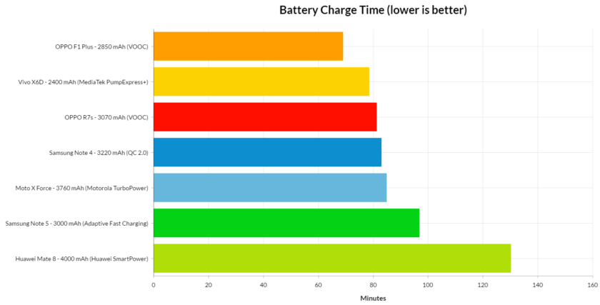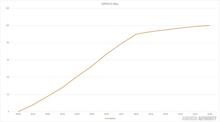 همان گونه که در نمودار بالا میبینید، فناوری VOOC بسیار سریع عمل میکند. Oppo F1 Plus ، گوشی هوشمندی که به فناوری VOOC مجهز شده است و از باطری 2850 میلی آمپر ساعتی برخوردار است تنها در 35 دقیقه 75 درصد شارژ شده است که بسیار خیره کننده است. زمان شارژ لازم از صفر تا 90 در این گوشی 45 دقیقه است و 1 ساعت و 9 دقیقه طول میکشد تا شارژ باطری این گوشی از صفر به صد در صد برسد که در اینجا میتوانیم اختلاف سرعت بین مرحله ی یک و دو فرآیند شارژ شدن را مشاهده کنیم. 45 دقیقه طول میکشد تا شارژ باطری از صفر به 90 در صد برسد اما ده در صد باقی مانده به 24 دقیقه زمان لازم دارد. اگر این امکان وجود داشت که سرعت در تمام مدت شارژ شدن ثابت و مانند مرحله ی اول باشد شاهد این بودیم که باطری F1 Plus در 50 دقیقه از صفر به صد در صد میرسید که نسبت به 69 دقیقه ی فعلی اختلاف زیادی محسوب میشود.