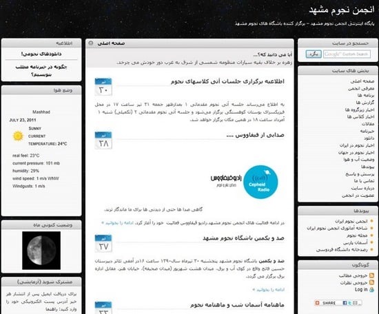 سایتی که در پیش رو دارید سایت اطلاع رسانی انجمن نجوم مشهد است. مسؤولیت مطالب و اخبار مندرج در این سایت، به غیر از محتوای سایتهایی که به آنها لینک داده شده است، به عهده انجمن نجوم مشهد است. با توجه به ساختار پویا و تغییرپذیر سایتهای اینترنتی و وبلاگها این انجمن هیچگونه مسؤولیتی را در قبال محتوای سایتهایی که به آنها لینک داده شده است ندارد.