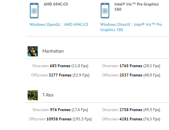 برای مقایسه به پردازنده گرافیکی PS4 اشاره می کنیم که در یک SOC نیمه سفارشی برای این کنسول تعبیه شده است؛ این تراشه در بخش گرافیکی خود دارای توان پردازشی 4.2 ترافلاپ است. در نتیجه توان آن برای یک پردازنده گرافیکی مجتمع بسیار مناسب است. این پردازنده گرافیکی در مقابل Intel Iris Pro 580 مورد ارزیابی قرار گرفته است، اما چگونه؟ می دانیم که اگر یک پردازنده (CPU یا GPU) در پایگاه داده Sisoft Sandra ثبت شده باشد، به طور حتم سر و کله آن در پایگاه های داده GFXBench و Compubench نیز پیدا می شود. اسلاید های داخل متن نشانگر همین مقایسه (بین پردازنده گرافیکی مجتمع AMD و Intel Iris Pro 580) هستند. برخی حدس می زنند که این تراشه به سفارش Apple تولید شده است و برای یک مصرف خاص طراحی گشته. آیا این تراشه MCM یک مشتری خاص دارد که نیازمند توان پردازشی بالا در GPU و CPU بدون اضافه شدن یک کارت گرافیک مجزا است؟ شایان ذکر است که هیچ از شرکت های Intel و AMD تا کنون این مسئله را تائید نکرده اند.