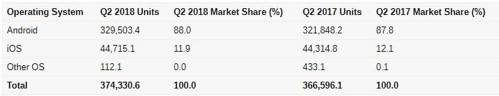 در جدول پایین هم میزان فروش گوشی های هوشمند براساس سیستم عامل را مشاهده می کنید که جزئیات تازه ای برای گفتن ندارد. iOS میزان فروش گوشی های آیفون است که دقیقا مشابه با جدول بالایی می باشد. میزان فروش اندروید هم در میان شرکت های سازنده توزیع شده است.