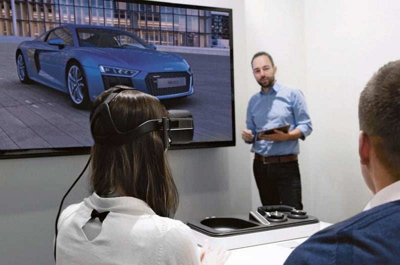 شرکت آئودی فروشندگان محصولات خود را به ابزار واقعیت مجازی مجهز میکند تا با استفاده از این قابلیت مشتریان بتوانند قبل از خرید، هر مدلی از خودروهای آئودی را که میخواهند بصورت مجازی تجربه کنند و تصمیم خود را با آگاهی کامل خریداری کنند.