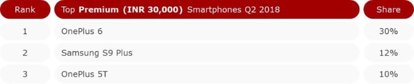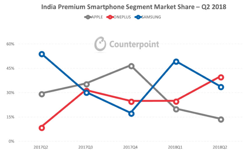 سه برند برتر سامسونگ، وان پلاس و اپل حالا 88 درصد سهم بازار گوشی های بالارده را تشکیل میدهند، در مقایسه با سه ماهه اول که آنها 95 درصد بازار را تشکیل داده بودند، حالا عضوهای جدیدی مانند برندهای هواوی (P20)، ویوو (X21)، اچ ام دی گلوبال (نوکیا 8 سیروکو) و ال جی (V30 Plus) در بازار هند حضور یافته اند.
