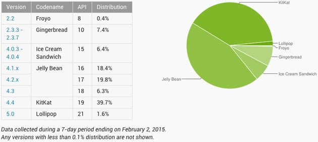 سیستم عامل اندروید آب نبات چوبی بر خلاف تصورات ، نتوانست در زمان عرضه شدنش طوفان به پا کند! پذیرش اولیه این سیستم عامل به قدری کند بود که نتوانست تاثیر خاصی در آمار سهم استفاده را در چند ماه اول ثبت کند. اما بر اساس جدیدترین آمار ارائه شده توسط گوگل، حالا به نظر می رسد کاربران به آرامی در حال شروع به پذیرش و استفاده از این محصول جدید هستند. این اطلاعات منتشر شده توسط گوگل نشان می دهد که با شروع ماه فوریه 2015 ، در حدود 1.6 درصد از کاربران فعال اندرویدی در حال استفاده از نسخه آب نبات چوبی این سیستم عامل می باشند. این آمار قطعا میزان قابل توجهی نیست اما نشان می دهد که حداقل دستگاه های نکسوس و به روز رسانی های سریع ارائه شده برای برخی از محصولات (مخصوصا برای مدل های عرضه شده توسط اچ تی سی ، ال جی و موتورولا) سهم خود را به خوبی ایفا نموده اند.