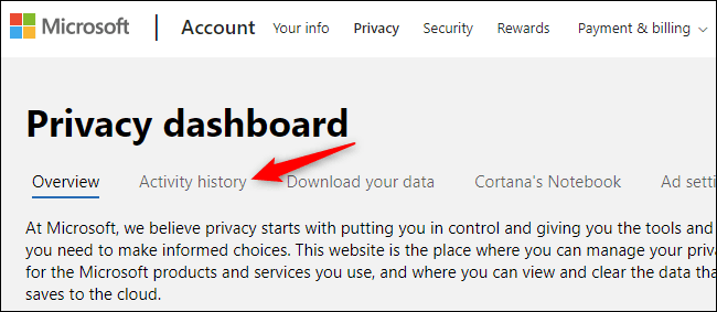 این صفحه در واقع داشبورد مایکروسافت شما است که در مرورگرتان اجرا شده و باید بر روی Activity history کلیک نمایید.