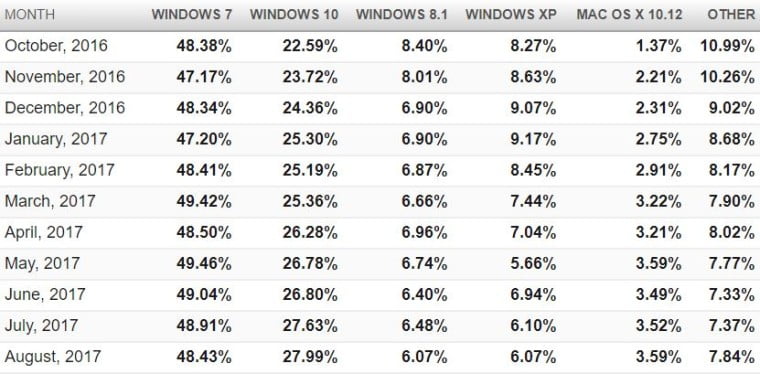 ماه گذشته بود که آمارهای منتشر شده نشان دهنده افزایش استفاده از ویندوز 10 در جهان به میزان 1 درصد و رسیدن سهم این نسخه از بازار به 27.63 درصد بود. گزارشات منتشر شده در ماه اخیر نیز با وجود نشان دادن رشد استفاده از ویندوز 10، باز هم ویندوز 7 را پر استفاده ترین سیستم عامل رایانه های جهان می دانند. بر اساس این گزارش که توسط موسسه اطلاعاتی Net Market Share منتشر شده، در حال حاضر سهم ویندوز 10 از بازار رایانه ها در دنیا تقریبا به 28 درصد رسیده که نشان دهنده رشد نزدیک به 3 درصدی در طول یک ماه گذشته بوده است. همچنین سهم ویندوز 7 نیز به 48.43 درصد رسیده و این نسخه را در صدر پر استفاده ترین ها قرار داده است. نکته جالب در این گزارش، سهم ویندوز 8.1 از بازار است که تنها 6 درصد را شامل می شود و با سهم ویندوز XP برابری می کند. با در نظر گرفتن این اعداد می توان به دو نتیجه رسید که عبارت اند از عدم استقبال کاربران از ویندوز 8.1 و البته مهاجرت سریع آنها به ویندوز 10؛ امری که درباره ویندوز 7 رخ نداده بود. در این گزارش آمده است که سیستم عامل Mac نسخه 10.12 تنها چیزی نزدیک به 3.5 درصد از بازار سیستم عامل های جهان را در اختیار دارد که نشان دهنده سهم کلی اپل از این بازار است.