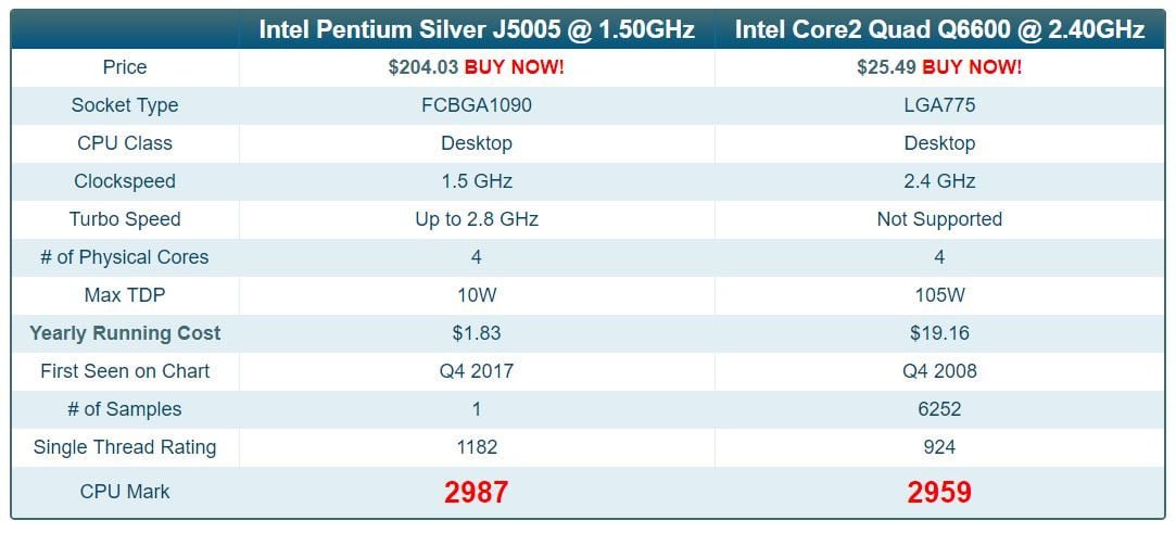 پردازنده Intel Pentium Silver J5005 که از گونه های میان رده این شرکت برای تجهیزات کم مصرف است، به تازگی در قالب خانواده های Silver و Gold معرفی شده است. حال، این پردازنده مجتمع در مقابل Core 2 Quad Q6600 قرار گرفته و آن را در بنچمارک CPU Passmark شکست داده است. پردازنده Intel Pentium Silver J5005 با کسب امتیاز 2987 در برابر امتیاز 2959 که برای Core 2 Quad Q6600 به ثبت رسیده است، از سد این پردازنده دوست داشتنی و کهنه کار رد شده است.