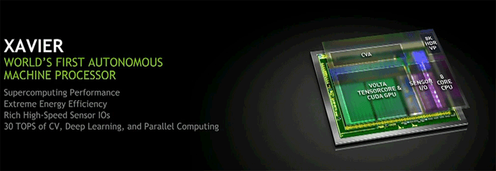 Xavier یک SOC مجتمع است که در اتومبیل های هوشمند سال 2019 مورد استفاده قرار می گیرد. Xavier از 8 پردازنده سفارشی در کنار شتاب دهنده های گرافیکی جدید بهره می برد. این کامپیوتر می تواند 20 تریلیون عملیات را در هر ثانیه پردازش نماید! این در حالی است که برای این مقدار تنها 20 وات توان مصرف می گردد! تراشه مجتمع جدید از معماری گرافیکی Volta بهره می برد که در لیتوگرافی 16 نانومتری به تولید رسیده است. Xavier دارای 7 میلیارد ترانزیتسور فعال است و از استاندارد ISO 26262 پشتیبانی می کند. استاندارد ISO 26262 یکی از قوانینی است که برای خودروهای خودران تدوین شده است. در پایان شما را با یک ویژگی جالب توجه غافلگیر خواهیم کرد؛ تراشه های Xavier به هسته های Tensor مجهز شده اند! هسته های Tensor یک پردازنده بی نظیر در شبکه های عصبی هستند که حتی قادر به شبیه سازی مجازی خود هستند.
