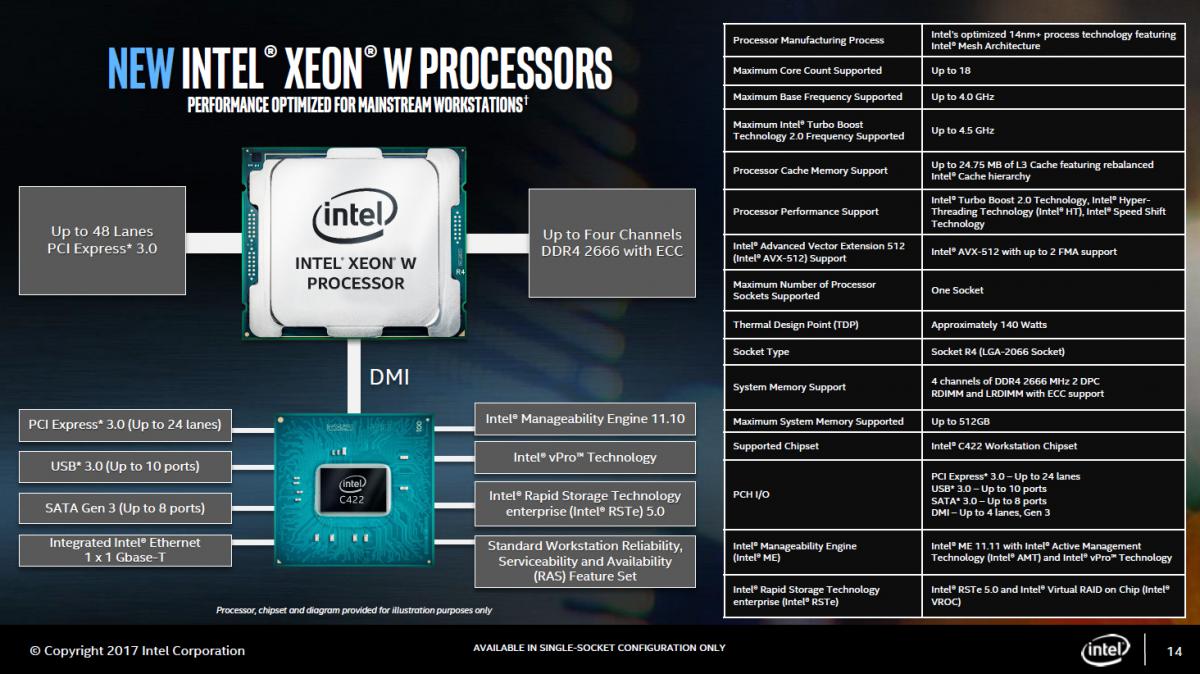 Xeon W-2155 | 10/20 | 3.3GHz | 4.5GHz | 13.75MB | 48 | 140W | $ 1440 |