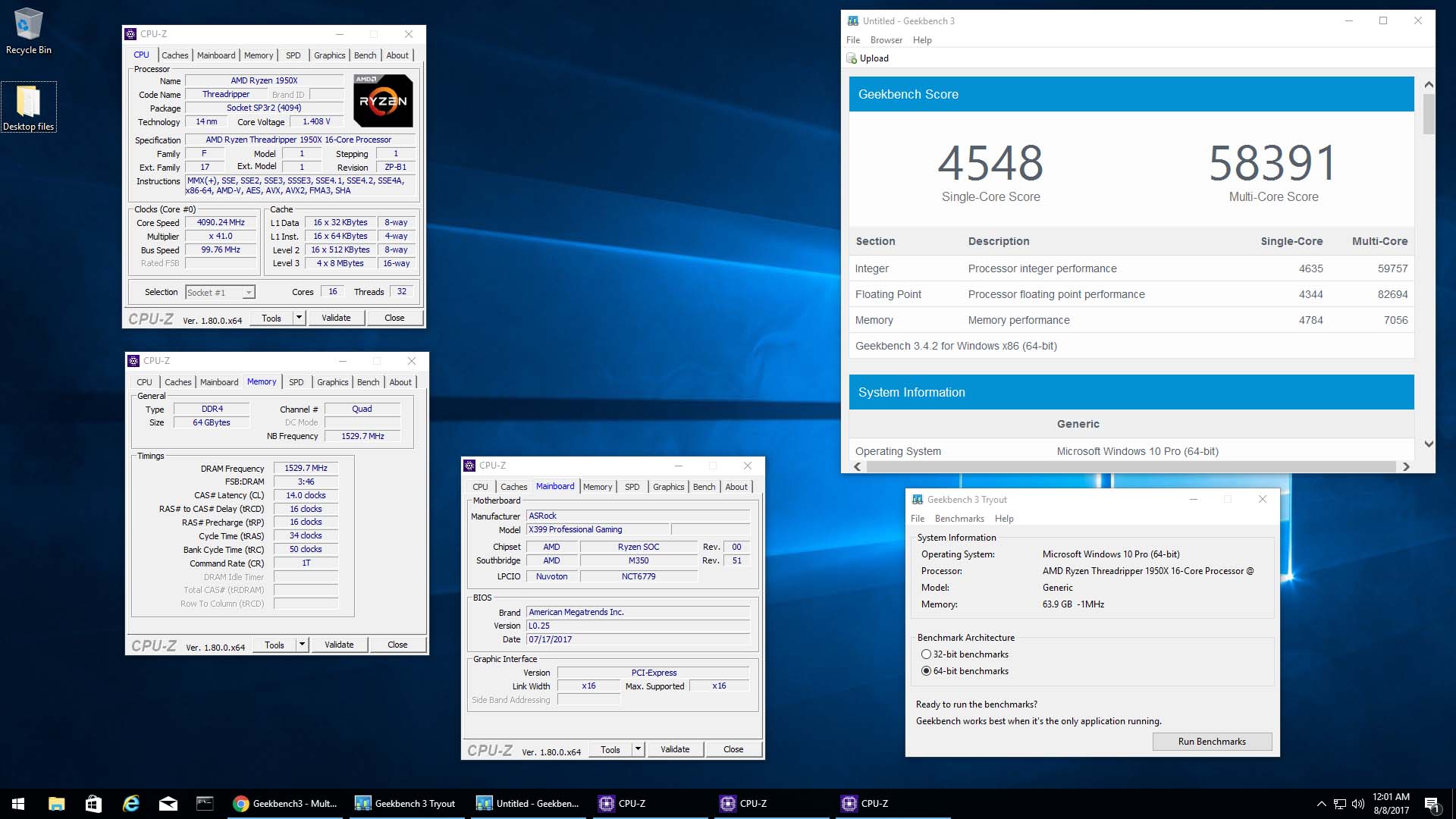 همچنین تمامی 8 اسلات مادربرد با رم های DDR4 در فرکانس 3066 مگاهرتز پر شده است. این پردازنده در بنچمارک  Geekbenck 3 دارای فرکانس 4.1 گیگاهرتز و در آزمون Cinebench R15 نیز بر روی فرکانس کاری 4.0 گیگاهرتز قرار داشته است. 1950X امتیاز 3337 را در Cinebench R15 به ثبت رسانده است. با اینکه می دانیم مقایسه پردازنده هایی با تعداد هسته های متفاوت کاری اشتباه و غیر حرفه ای است، اما پردازنده Intel Core i7 7900X نیز در این آزمون امتیاز های 2169 و 2464 را با فرکانس حداکثر 4.6 گیگاهرتز به دست آورده است. در نتیجه 1950X رکورد Cinebench R15 را در پردازنده های کلاس دسکتاپ شکسته و در صورتی که اینتل برای جا به جایی این رکورد علاقمند است، باید از پردازنده های سری دوم Core-X استفاده نماید. هر دو پردازنده، در زمان اورکلاک به عملکرد 35% بالاتر دست پیدا می کنند. همچنین 1950X در فرکانس 4.1 گیگاهرتز و وضعیت تمام هسته، آزمون Geekbenck 3 را با امتیاز 58391 پاس کرده است.