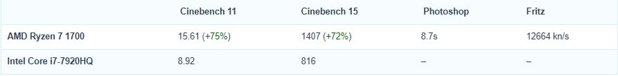 توان حرارتی و مصرفی پردازنده Core i7-7920HQ کمتر از رقیب خود (45 وات) است، اما کارایی Ryzen 7 1700 به مراتب بالاتر است. با این حساب عملکرد پردازنده ی Ryzen 7 1700 ستودنی است و این در حالی است که قیمت تمام شده لپ تاپ های مبتنی بر آن، به مراتب کمتر از رقیب اینتلی خود است! Ryzen 7 1700 یک انتخاب ایده آل برای لپ تاپ های جدید است.