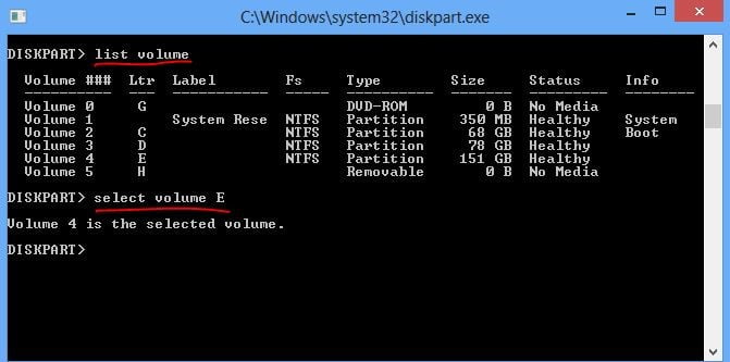 برای مخفی کردن درایو ها ، وارد حساب کاربری ادمین شده سپس با نگه داشته کلید ویندوز ، کلید R را فشار دهید تا Run باز شود. حال عبارت cmd را در آن تایپ کرده و کلید اینتر را فشار دهید. در ویندوز 8 ممکن است سوالی مبنی بر این که قصد تغییر در کامپیوتر را دارید پرسیده شود که با کلیک بر روی yes به ادامه کار می پردازیم. در صفحه cmd با تایپ عبارت list volume و با فشار دادن کلید اینتر لیست درایو های کامپیوتر نمایش داده می شود. برای مخفی کردن هر کدام از درایو ها نام آن درایو را نوشته و کلید اینتر را فشار می دهیم. برای مثال برای مخفی کردن درایو E عبارت select volume E را مینویسیم.