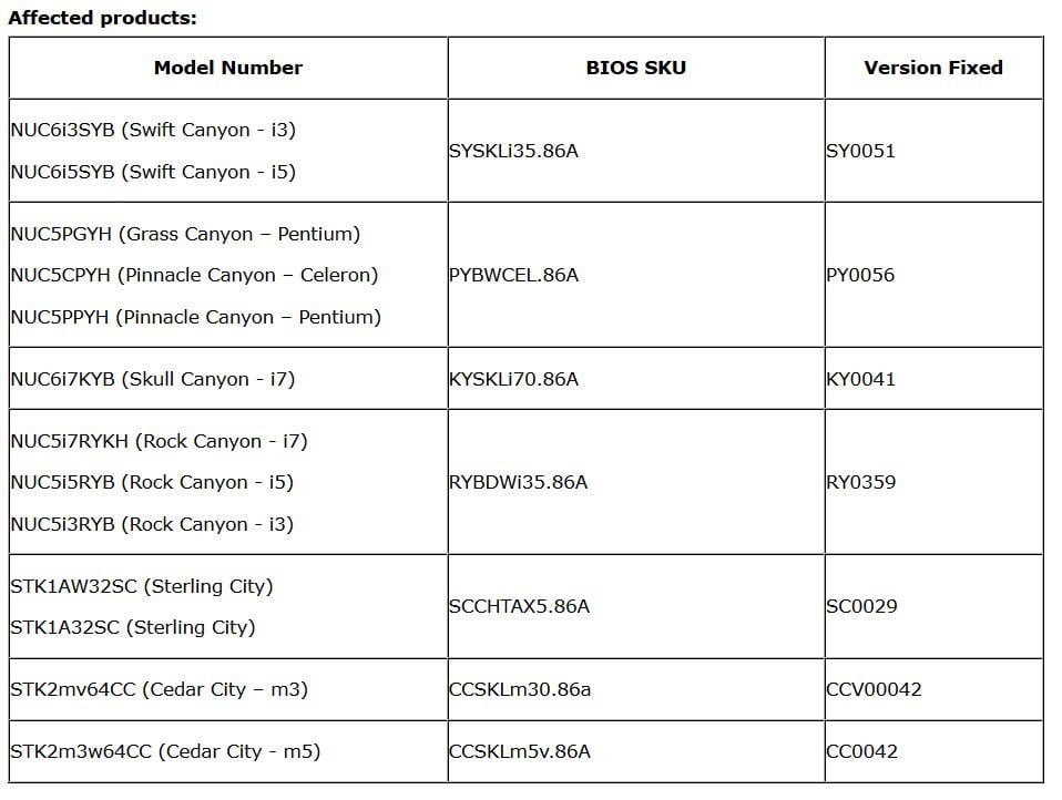 مدل های Swift Canyon،Grass Canyon و Pinnacle Canyon از جمله این کامپیوترها هستند. در این میان حتی کامپیوترهای Skull Canyon نیز در امان نبوده و مستعد این باگ هستند. کمپانی اینتل در واکنش به چنین مشکلی به سرعت نسخه ای جدید از بایوس این محصولات را منتشر و در اختیار کاربران خود قرار داده است که می تواند حفره ی امنیتی به وجود آمده را از میان بردارد.