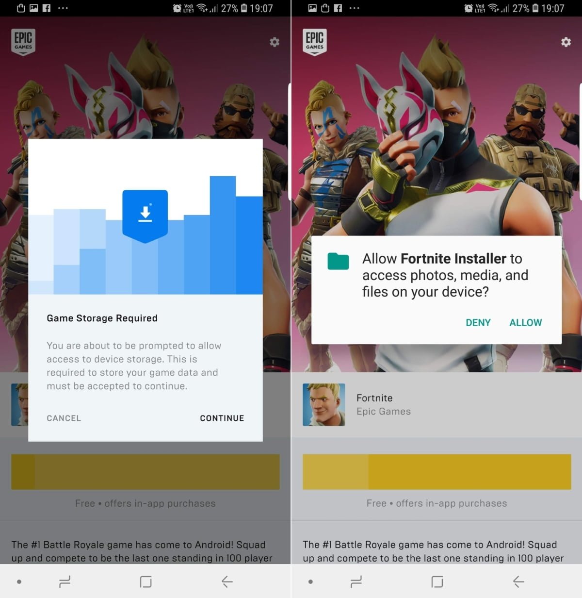 گام چهارم: اینستالر فورت نایت سریعاً شروع به دانلود بازی اصلی می کند، اما قبل از آن شما باید به برنامه اجازه دسترسی به حافظه گوشی را بدهید.