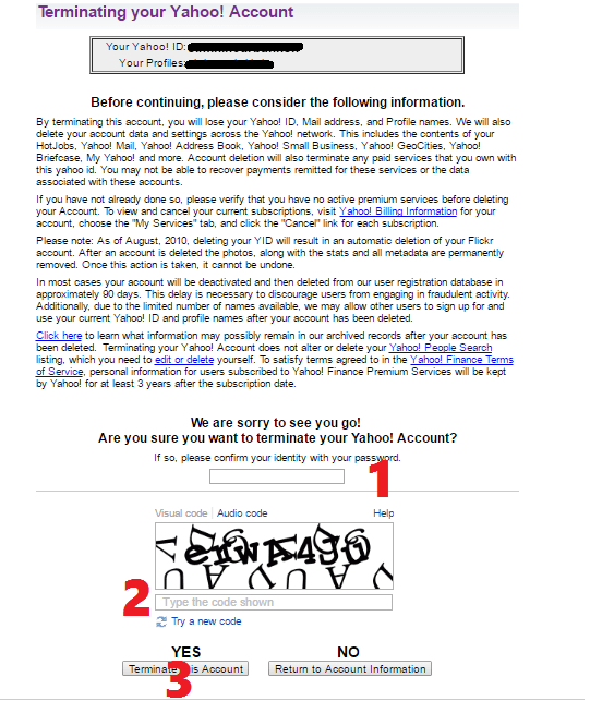 پس از وارد کردن رمز عبور در کادر 1 و کد امنیتی در کادر 2 ، بر روی گزینه 3 کلیک کنید. زمانیکه شما اینکار را انجام میدهید، پردازش اطلاعات برای حذف اکانت 90 روز طول میکشد. این زمان برای منصرف کردن مردم و یا جلوگیری از حذف اکانت کاربران در صورت هک شدن است. اما پس از طی این 3 ماه میتوانید برای همیشه با اکانت یاهوی خودتان خداحافظی کنید.