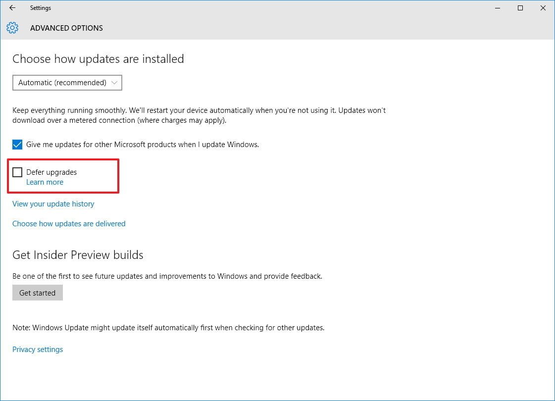 با فعال کردن ویژگی Defer Upgrades تنها بروزرسانی بزرگ مانند Anniversary Update به طور اتوماتیک بر روی دستگاه شما نصب نخواهد شد و بروزرسانی هایی از قبیل پچ های امنیتی همچنان به طور خودکار دانلود و نصب خواهند شد.