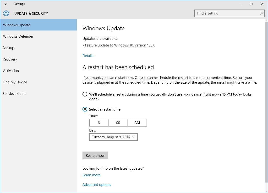 به طور عادی در صورتی که شما تغییراتی را در روند بروزرسانی ویندوز 10 انجام نداده باشید، Anniversary Update نیز مانند دیگر بروزرسانی ها به طور اتوماتیک و بدون کسب اجازه از شما نصب خواهد شد. اما شما میتوانید از طریق زمان بندی قسمت آپدیت، نصب بروزرسانی را برای زمانی دیگر موکول کنید. این در حالیست که فایل های بروزرسانی توسط ویندوز به طور خودکار دانلود شده اند و آماده ی نصب هستند و شما میتوانید در صورت نداشتن وقت کافی برای نصب بروزرسانی و موکول کردن فرآیند به زمانی دیگر و یا برای برطرف شدن باگ های نسخه ی جدید میخواهید صبر کنید از قابلیت زمان بندی نصب بروزرسانی ها استفاده کنید. برای این کار اقدامات زیر را انجام دهید.