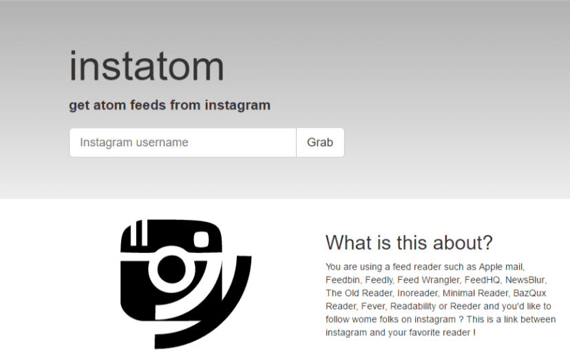 شما با جایگزین کردن username در لینک http://instatom.freelancis.net/username میتوانید از آن پیج اینستاگرامی خوراک تهیه کنید. یا اینکه به آدرس http://instatom.freelancis.net/ بروید و در کادری که برای شما ایجاد شده است username صفحه مورد نظرتان را تایپ کرده و روی گزینه grab کلیک کنید.