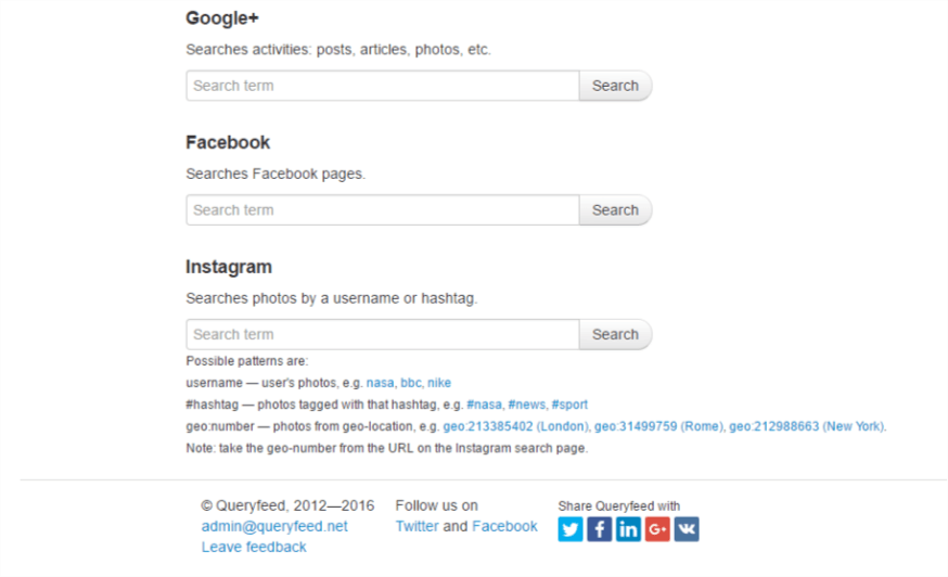 در Queryfeed میتوانید از صفحه اینستاگرامی مورد نظرتان یا از هشتگ خاصی که مد نظرتان است خوراک تهیه کنید. کافیست با ورود به این سایت اسکرول کرده و کمی پایین تر در بخش instagram هشتگ یا نام کاربری که مد نظرتان است را وارد کنید. در Queryfeed علاوه بر اینستاگرام از توییتر، فیسبوک و گوگل پلاس نیز میتوانید فید تهیه کنید.
