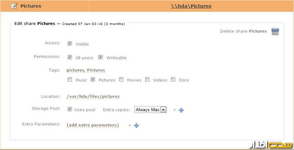 بهصورت پیشفرض سرور Amahi تعدادی پوشه به اشتراک گذاشتهشده شامل پوشههای Pictures، Music، Movies، Books و موارد دیگر ایجاد میکند و همه کاربران در شبکه دسترسی کامل به این پوشهها را دارند. جهت مدیریت و ایجاد پوشههای اشتراکی در شبکه توسط سرور Amahi میتوانید طبق مراحل زیر عمل کنید: