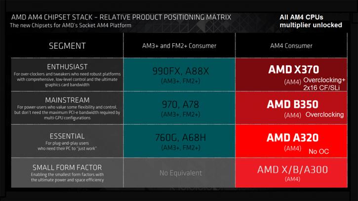 چیپست های مورد بحث با نام های X370, B350 و A320 شناخته می شوند.آنها مزین به پشتیبانی از اسلات PCI 3.0 X16،سازگاری با حافظه های DDR4،پشتیبانی از حافظه های ذخیره سازی M.2 و NVME هستند. Summit Ridgeها نیز ضمن استفاده از سوکت AM4،نیازمند چیپست هایی جدید است که معرفی آنها به همین منظور است.همانطور که در روزهای گذشته نیز بدان اشاره شد،چیپست X370 به عنوان پرچمدار این خانواده محسوب می شود و پسوند X به معنی Extreme است. کاربران حرفه ای می توانند از مادربردهای مجهز به این چیپست استفاده نمایند و از جمله مهمترین ویژگی های آن می توان به پشتیبانی از Multi GPU در پیکربندی های SLI و CrossFire بر روی آخرین نسل از اسلات های PCI اشاره کرد.