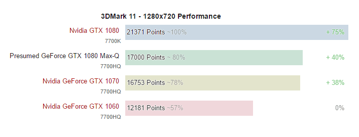 جالب است بدانید که کارت گرافیک NVIDIA GTX 1080 Max-Q در پیکربندی های SLI نیز عرضه می گردد. نوت بوک چک گزارش می دهد که احتمالا کارت گرافیک های کارت گرافیک NVIDIA GTX 1070 Max-Q نیز به زودی معرفی خواهند شد. نوت بوک چک، این کارت گرافیک را در کنار کارت گرافیک نسخه دسکتاپ GTX1080 به همراه پردازنده Core i7-7700K قرار داده است. از سوی دیگر NVIDIA GTX 1080 Max-Q به همراه پردازنده 4 هسته ای Core i7-7700HQ مورد بررسی قرار گرفته است که تصویر آزمون نهایی در 3D Mark با دقت 1280×720 قابل مشاهده است. مجموعه VC نیز گزارش می دهد که کارت گرافیک GTX 1080 Max-Q در مدل جدید خود دارای توان حرارتی 110 وات است. این در حالی است که این مقدار در نسخه ساده ی GTX1080 قابل نصب در نوت بوک ها، 165 وات است. در بخش زیرین می توانید مقایسه مشخصات فنی دو کارت گرافیک GTX 1080 Max-Q و GTX1080 که هر دو برای نوت بوک ها قابل نصب هستند را مشاهده نمائید؛ و همانطور که خواهید دید، تنها در زمینه فرکانس هسته شاهد تغییر خواهیم بود.