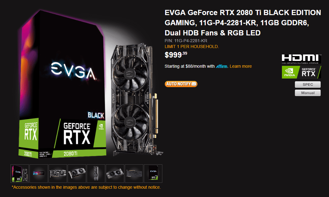 این شرکت یک کارت گرافیک GeForce RTX 2080 Ti با نام EVGA RTX 2080 Ti Black Edition Gaming را در بخش فروش آنلاین وب سایت خود، با قیمت 999 دلار برای پیش خرید قرار داده است. حتی 200 دلار کمتر از نمونه مرجع انویدیا. این کارت گرافیک دارای PCB رفرنس یا مرجع بوده و از تمامی فرکانس های مرجع برخوردار است. با این وجود یک کولر سفارشی با 2 عدد فن برای آن در نظر گرفته شده است.