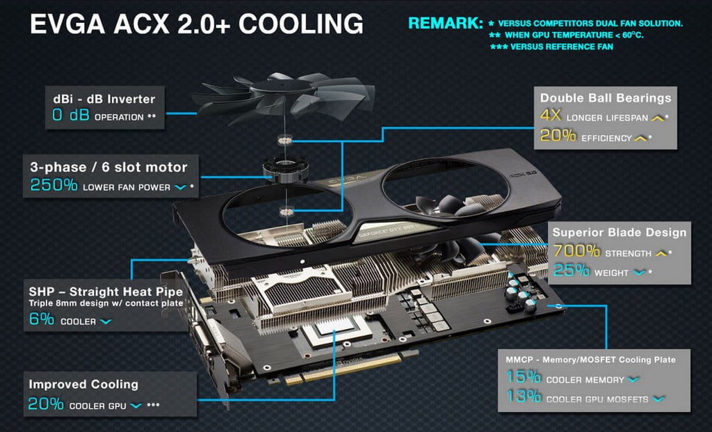همچنین در سیستم خنک کننده ACX 2.0+ موارد دیگری مانند طراحی جدید پره های فن، دو بلبرینگ و موتور فوق کم مصرف برای چرخش فن تدارک دیده شده است. استفاده از بلبرینگ های جدید سبب افزایش 4 برابری طول عمر سیستم خنک کننده و بهبود کارایی 20 درصدی در خنک سازی کارت گرافیک می شود.