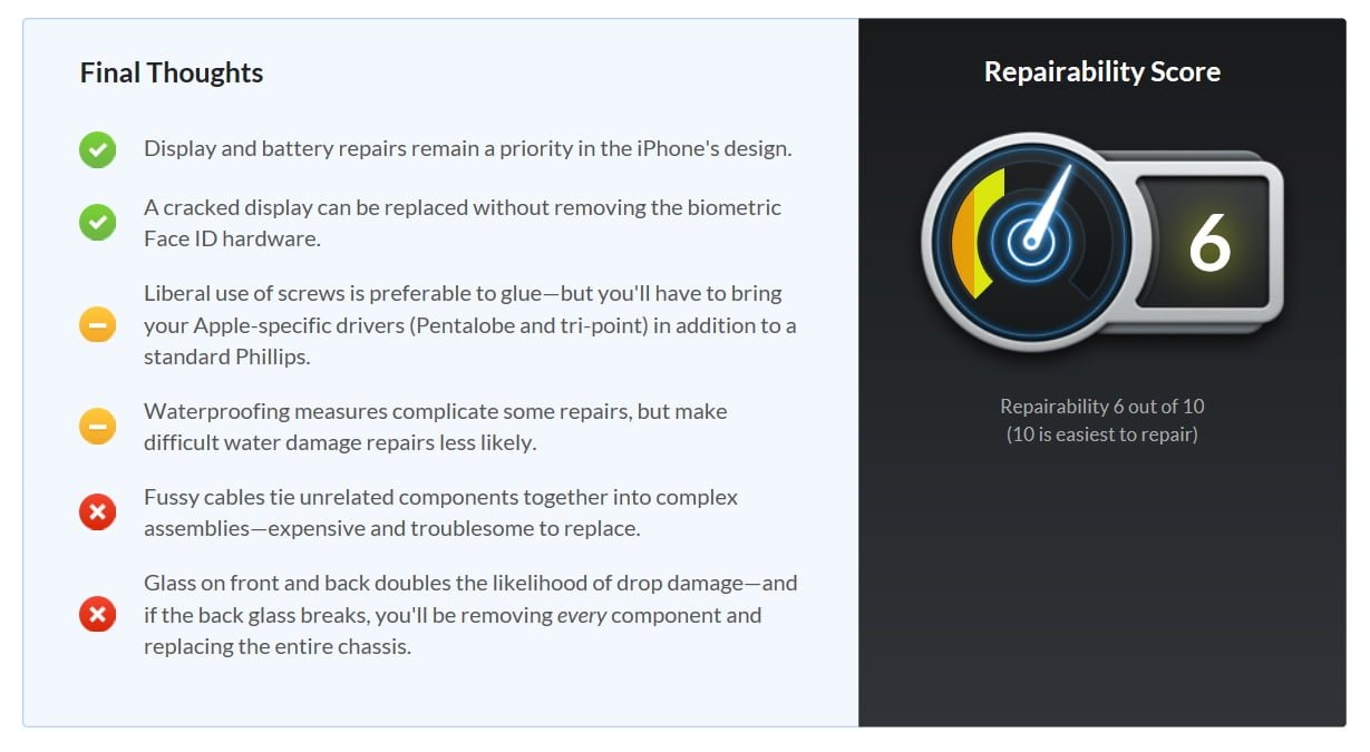 همان طور که اشاره شد این گوشی نمره تعمیرپذیری 6 را از iFixit دریافت کرده است. اصلی ترین نکات مثبت درباره تعمیرپذیری گوشی به سهولت در تعویض باتری و نمایشگر و امکان تعویض صفحه نمایش ترک خورده یا شکسته شده بدون نیاز به خارج کردن سخت افزار مربوط به FaceID هستند. در طرف دیگر اسمبلی بسیار پیچیده در برخی قسمت ها که باعث افزایش هزینه تعمیرات می شوند و البته شیشه ای بودن بدنه که احتمال خطر را افزایش می دهد از جمله نکات منفی مورد اشاره iFixit هستند