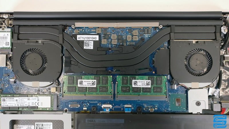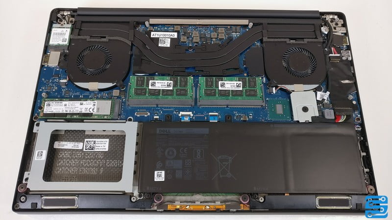 پس از باز کردن درب زیرین، تمامی سخت افزارها قابل مشاهده و دسترس هستند. از آنجایی که دل به دنبال کاهش ضخامت بوده است، این محصول دارای طراحی جالب توجهی در مادربرد است. قطعات همگی به صورت موازی نصب شده و در کنار هم هستند. همچنین مهندسان دل ترجیح داده اند تا سخت افزارها را به صورت اسلات به مادربرد متصل کرده و اکثر کابل کشی ها را از میان ببرند و یا آنها را به زیر مادربرد انتقال داده اند.