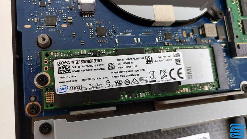 در زمینه ذخیره سازی هیچ هارد دیسکی وجود ندارد؛ این الگو برای بسیاری از XPS های جدید به همین منوال است. عدم استفاده از هارد دیسک ضخامت محصول را کاهش داده و مصرف انرژی را پایین می آورد. در نهایت به افزایش سرعت اشاره می کنیم. دل از یک ماژول SSD M.2 در استاندارد 2280 استفاده کرده است. این ماژول مدل Intel 600P است که 512 گیگابایت ظرفیت دارد. با این وجود یک محفظه ی 2.5 اینچی در کنار باتری نیز موجود است. این سالید از مدل های NVME است که مستقیما از مسیر PCI Express بهره می برند.